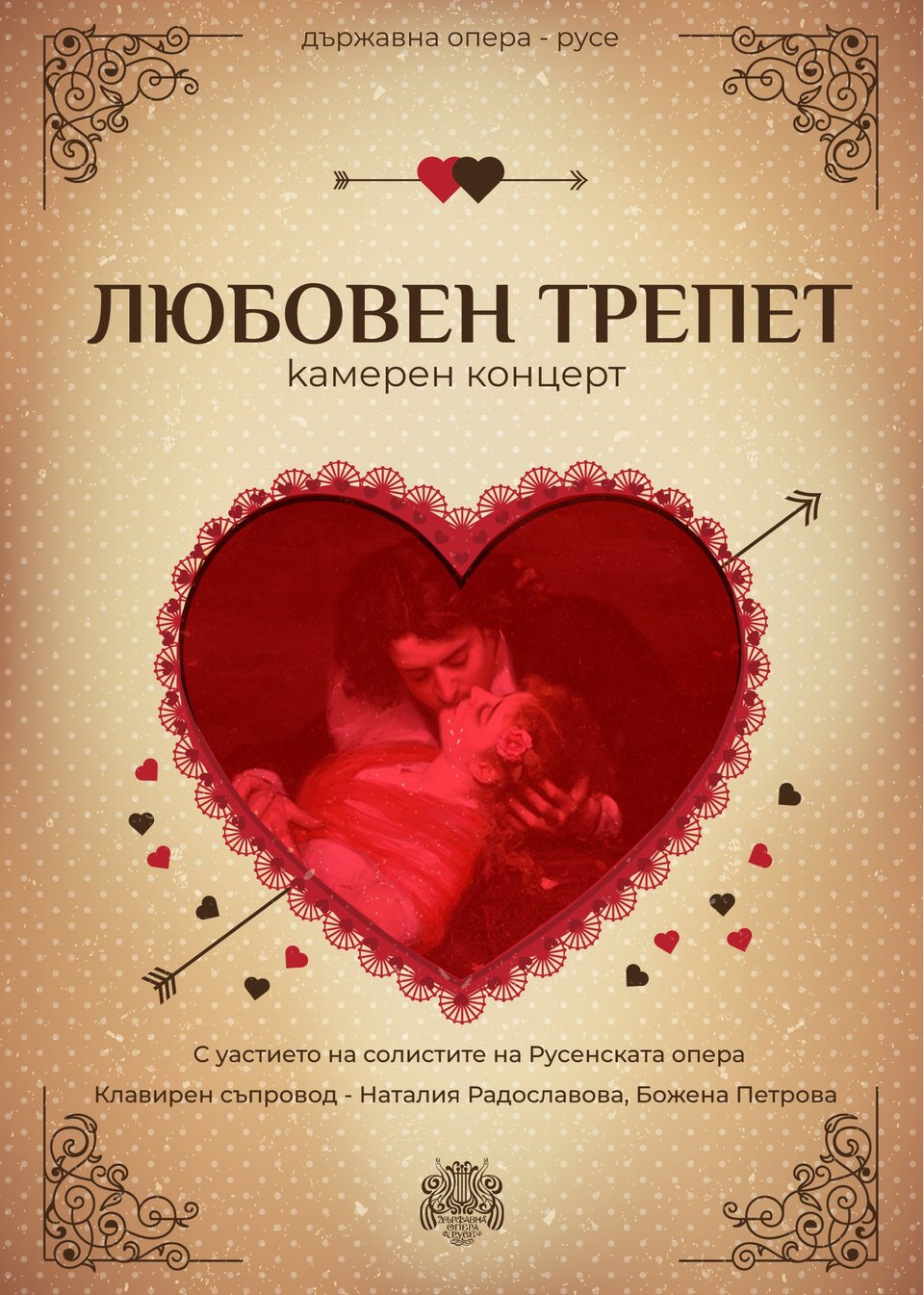 On the day dedicated to love, the soloists of State Opera Ruse will present a carefully selected program of refined musical revelations about love, with piano accompaniment by Natalia Radoslavova and Bozhena Petrova.
