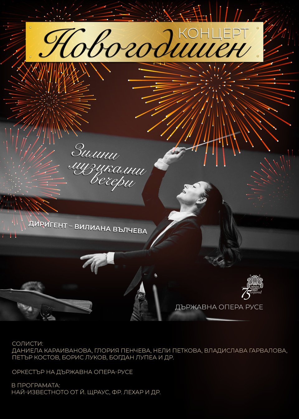 Програмата включва най-известните произведения на Йохан Щраус и Франц Лехар, предлагайки магическо пътешествие чрез валсове, полки и класики от оперетата, които са очаровали поколения. Концертът улавя духа на празника, елегантността и радостта, създавайки перфектната атмосфера за посрещане на Новата година.